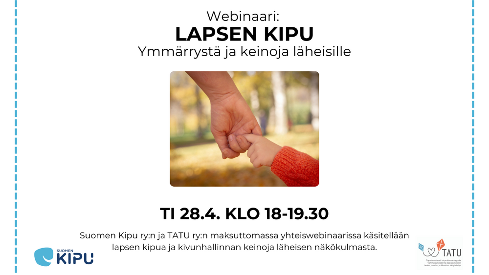 Suomen Kipu ry:n ja TATU ry:n yhteiswebinaarissa 28.4. klo 18 käsitellään lapsen kipua ja kivunhallinnan keinoja. Käymme läpi aihetta läheisen näkökulmasta: mitä läheinen voi tehdä tukeakseen lasta…