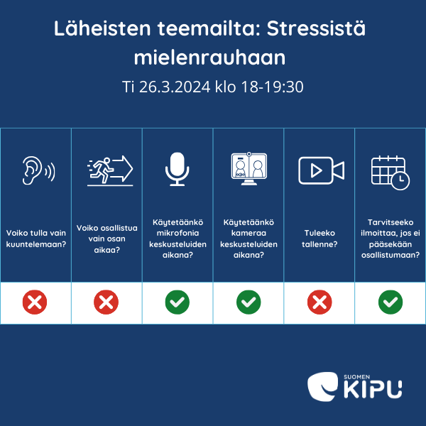 Suomen Kipu järjestää keskustelevan teemaillan ti 26.3. klo 18-19:30. Teemaillassa käydään yhdessä työstäen läpi stressin aiheuttajia, stressinhallintakeinoja sekä itsemyötätuntoa. Työstämme aiheita keskustellen sekä erilaisten harjoitusten kautta. Keskusteluun osallistuaksesi tarvitset toimivan mikrofonin. Voit myös osallistua chattia käyttäen.