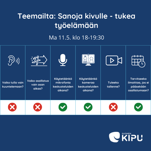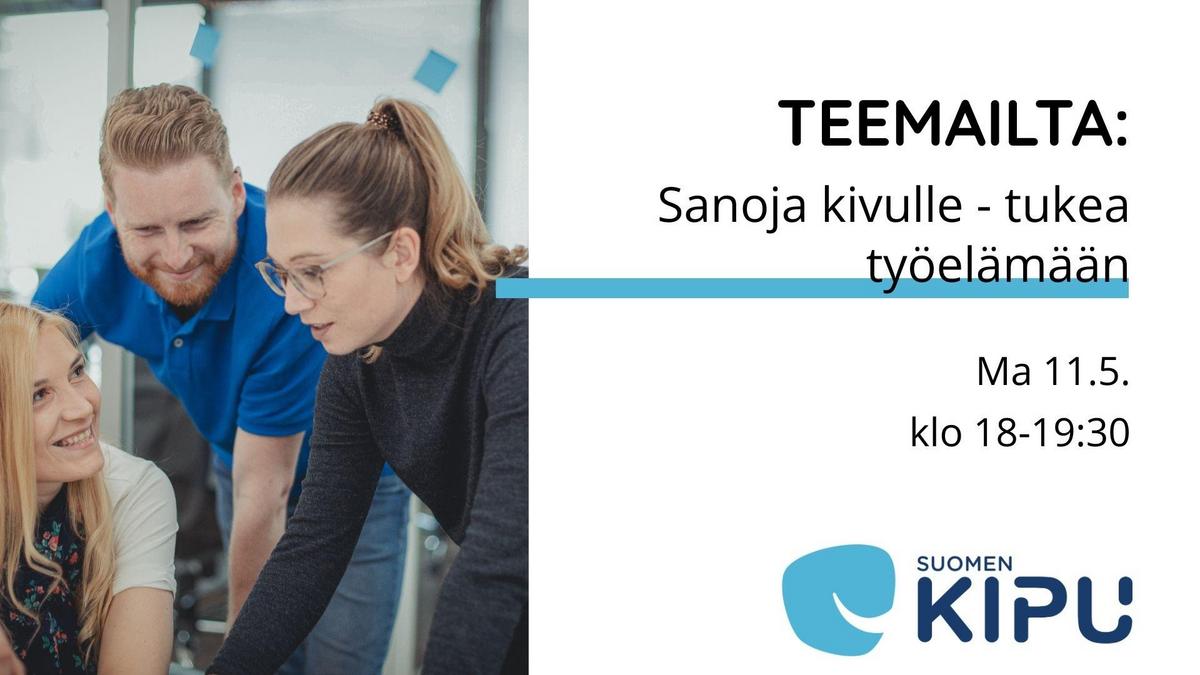Teemailta, jossa pohditaan yhdessä keskustellen sitä, miten omaa kipua voisi tuoda itselle sopivalla tavalla esille ja puheeksi työelämässä