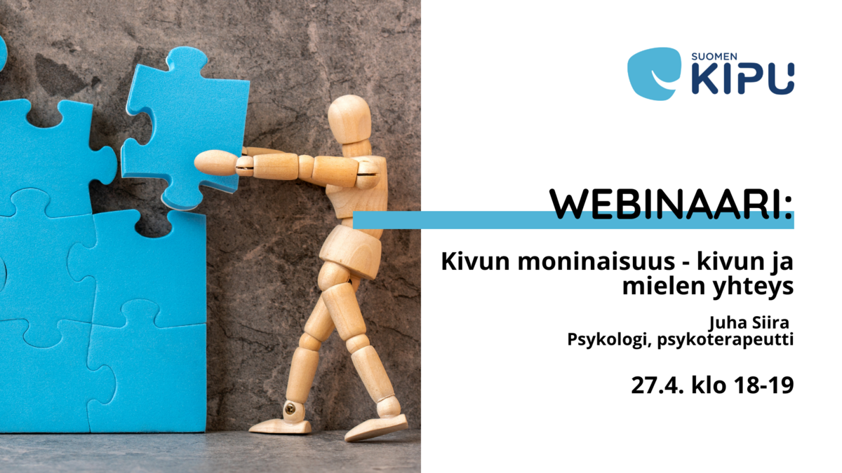 Kipu ja kokemus kivusta vaikuttavat myös mieleen ja mielenterveyteen. Kivusta saattaa seurata stressiä, ahdistusta ja jopa masennusta. Tässä webinaarissa 27. huhtikuuta klo 18-19 psykologi ja psykoterapeutti Juha Siira tulee kertomaan meille kivun moninaisuudesta, kivun ja mielen yhteydestä sekä mielenterveydestä.